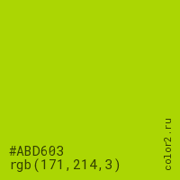 Цвет #ABD603 в цветовой модели RGB обозначается тремя октетами (171, 214, 3) в десятичном формате и #ABD603 в шестнадцатиричном (hex) формате, которые являются интенсивностью красного 171 (hex AB), интенсивность зелёного 214 (hex D6) и интенсивность синего 3 (hex 03).