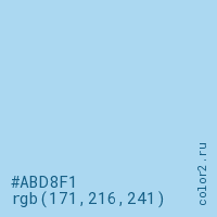 Цвет #ABD8F1 в цветовой модели RGB обозначается тремя октетами (171, 216, 241) в десятичном формате и #ABD8F1 в шестнадцатиричном (hex) формате, которые являются интенсивностью красного 171 (hex AB), интенсивность зелёного 216 (hex D8) и интенсивность синего 241 (hex F1).