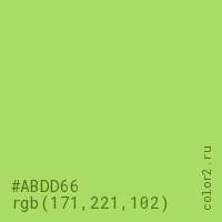 Цвет #ABDD66 в цветовой модели RGB обозначается тремя октетами (171, 221, 102) в десятичном формате и #ABDD66 в шестнадцатиричном (hex) формате, которые являются интенсивностью красного 171 (hex AB), интенсивность зелёного 221 (hex DD) и интенсивность синего 102 (hex 66).
