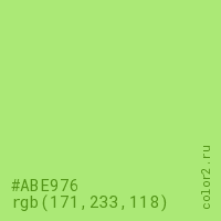 Цвет #ABE976 в цветовой модели RGB обозначается тремя октетами (171, 233, 118) в десятичном формате и #ABE976 в шестнадцатиричном (hex) формате, которые являются интенсивностью красного 171 (hex AB), интенсивность зелёного 233 (hex E9) и интенсивность синего 118 (hex 76).