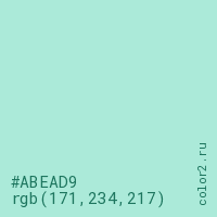 Цвет #ABEAD9 в цветовой модели RGB обозначается тремя октетами (171, 234, 217) в десятичном формате и #ABEAD9 в шестнадцатиричном (hex) формате, которые являются интенсивностью красного 171 (hex AB), интенсивность зелёного 234 (hex EA) и интенсивность синего 217 (hex D9).