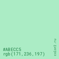 Цвет #ABECC5 в цветовой модели RGB обозначается тремя октетами (171, 236, 197) в десятичном формате и #ABECC5 в шестнадцатиричном (hex) формате, которые являются интенсивностью красного 171 (hex AB), интенсивность зелёного 236 (hex EC) и интенсивность синего 197 (hex C5).