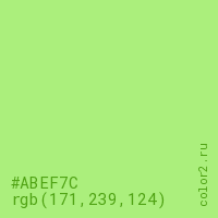 Цвет #ABEF7C в цветовой модели RGB обозначается тремя октетами (171, 239, 124) в десятичном формате и #ABEF7C в шестнадцатиричном (hex) формате, которые являются интенсивностью красного 171 (hex AB), интенсивность зелёного 239 (hex EF) и интенсивность синего 124 (hex 7C).