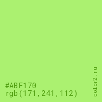 Цвет #ABF170 в цветовой модели RGB обозначается тремя октетами (171, 241, 112) в десятичном формате и #ABF170 в шестнадцатиричном (hex) формате, которые являются интенсивностью красного 171 (hex AB), интенсивность зелёного 241 (hex F1) и интенсивность синего 112 (hex 70).