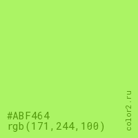Цвет #ABF464 в цветовой модели RGB обозначается тремя октетами (171, 244, 100) в десятичном формате и #ABF464 в шестнадцатиричном (hex) формате, которые являются интенсивностью красного 171 (hex AB), интенсивность зелёного 244 (hex F4) и интенсивность синего 100 (hex 64).