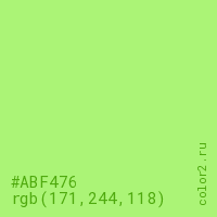 Цвет #ABF476 в цветовой модели RGB обозначается тремя октетами (171, 244, 118) в десятичном формате и #ABF476 в шестнадцатиричном (hex) формате, которые являются интенсивностью красного 171 (hex AB), интенсивность зелёного 244 (hex F4) и интенсивность синего 118 (hex 76).