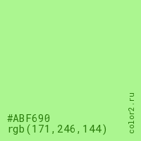 Цвет #ABF690 в цветовой модели RGB обозначается тремя октетами (171, 246, 144) в десятичном формате и #ABF690 в шестнадцатиричном (hex) формате, которые являются интенсивностью красного 171 (hex AB), интенсивность зелёного 246 (hex F6) и интенсивность синего 144 (hex 90).