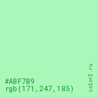 Цвет #ABF7B9 в цветовой модели RGB обозначается тремя октетами (171, 247, 185) в десятичном формате и #ABF7B9 в шестнадцатиричном (hex) формате, которые являются интенсивностью красного 171 (hex AB), интенсивность зелёного 247 (hex F7) и интенсивность синего 185 (hex B9).