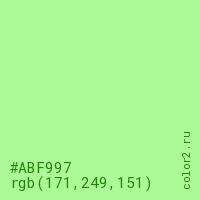 Цвет #ABF997 в цветовой модели RGB обозначается тремя октетами (171, 249, 151) в десятичном формате и #ABF997 в шестнадцатиричном (hex) формате, которые являются интенсивностью красного 171 (hex AB), интенсивность зелёного 249 (hex F9) и интенсивность синего 151 (hex 97).