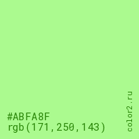 Цвет #ABFA8F в цветовой модели RGB обозначается тремя октетами (171, 250, 143) в десятичном формате и #ABFA8F в шестнадцатиричном (hex) формате, которые являются интенсивностью красного 171 (hex AB), интенсивность зелёного 250 (hex FA) и интенсивность синего 143 (hex 8F).