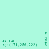Цвет #ABFADE в цветовой модели RGB обозначается тремя октетами (171, 250, 222) в десятичном формате и #ABFADE в шестнадцатиричном (hex) формате, которые являются интенсивностью красного 171 (hex AB), интенсивность зелёного 250 (hex FA) и интенсивность синего 222 (hex DE).