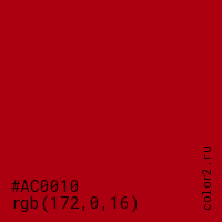 Цвет #AC0010 в цветовой модели RGB обозначается тремя октетами (172, 0, 16) в десятичном формате и #AC0010 в шестнадцатиричном (hex) формате, которые являются интенсивностью красного 172 (hex AC), интенсивность зелёного 0 (hex 00) и интенсивность синего 16 (hex 10).