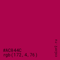 Цвет #AC044C в цветовой модели RGB обозначается тремя октетами (172, 4, 76) в десятичном формате и #AC044C в шестнадцатиричном (hex) формате, которые являются интенсивностью красного 172 (hex AC), интенсивность зелёного 4 (hex 04) и интенсивность синего 76 (hex 4C).