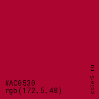 Цвет #AC0530 в цветовой модели RGB обозначается тремя октетами (172, 5, 48) в десятичном формате и #AC0530 в шестнадцатиричном (hex) формате, которые являются интенсивностью красного 172 (hex AC), интенсивность зелёного 5 (hex 05) и интенсивность синего 48 (hex 30).