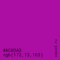 Цвет #AC0DA3 в цветовой модели RGB обозначается тремя октетами (172, 13, 163) в десятичном формате и #AC0DA3 в шестнадцатиричном (hex) формате, которые являются интенсивностью красного 172 (hex AC), интенсивность зелёного 13 (hex 0D) и интенсивность синего 163 (hex A3).