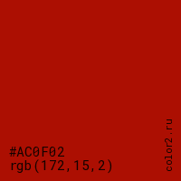 Цвет #AC0F02 в цветовой модели RGB обозначается тремя октетами (172, 15, 2) в десятичном формате и #AC0F02 в шестнадцатиричном (hex) формате, которые являются интенсивностью красного 172 (hex AC), интенсивность зелёного 15 (hex 0F) и интенсивность синего 2 (hex 02).