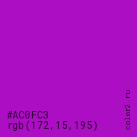 Цвет #AC0FC3 в цветовой модели RGB обозначается тремя октетами (172, 15, 195) в десятичном формате и #AC0FC3 в шестнадцатиричном (hex) формате, которые являются интенсивностью красного 172 (hex AC), интенсивность зелёного 15 (hex 0F) и интенсивность синего 195 (hex C3).