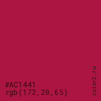 Цвет #AC1441 в цветовой модели RGB обозначается тремя октетами (172, 20, 65) в десятичном формате и #AC1441 в шестнадцатиричном (hex) формате, которые являются интенсивностью красного 172 (hex AC), интенсивность зелёного 20 (hex 14) и интенсивность синего 65 (hex 41).