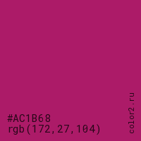 Цвет #AC1B68 в цветовой модели RGB обозначается тремя октетами (172, 27, 104) в десятичном формате и #AC1B68 в шестнадцатиричном (hex) формате, которые являются интенсивностью красного 172 (hex AC), интенсивность зелёного 27 (hex 1B) и интенсивность синего 104 (hex 68).