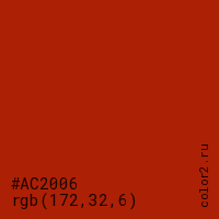 Цвет #AC2006 в цветовой модели RGB обозначается тремя октетами (172, 32, 6) в десятичном формате и #AC2006 в шестнадцатиричном (hex) формате, которые являются интенсивностью красного 172 (hex AC), интенсивность зелёного 32 (hex 20) и интенсивность синего 6 (hex 06).