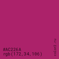 Цвет #AC226A в цветовой модели RGB обозначается тремя октетами (172, 34, 106) в десятичном формате и #AC226A в шестнадцатиричном (hex) формате, которые являются интенсивностью красного 172 (hex AC), интенсивность зелёного 34 (hex 22) и интенсивность синего 106 (hex 6A).