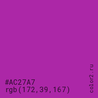 Цвет #AC27A7 в цветовой модели RGB обозначается тремя октетами (172, 39, 167) в десятичном формате и #AC27A7 в шестнадцатиричном (hex) формате, которые являются интенсивностью красного 172 (hex AC), интенсивность зелёного 39 (hex 27) и интенсивность синего 167 (hex A7).