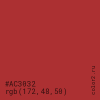 Цвет #AC3032 в цветовой модели RGB обозначается тремя октетами (172, 48, 50) в десятичном формате и #AC3032 в шестнадцатиричном (hex) формате, которые являются интенсивностью красного 172 (hex AC), интенсивность зелёного 48 (hex 30) и интенсивность синего 50 (hex 32).