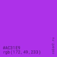 Цвет #AC31E9 в цветовой модели RGB обозначается тремя октетами (172, 49, 233) в десятичном формате и #AC31E9 в шестнадцатиричном (hex) формате, которые являются интенсивностью красного 172 (hex AC), интенсивность зелёного 49 (hex 31) и интенсивность синего 233 (hex E9).