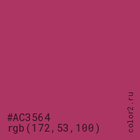 Цвет #AC3564 в цветовой модели RGB обозначается тремя октетами (172, 53, 100) в десятичном формате и #AC3564 в шестнадцатиричном (hex) формате, которые являются интенсивностью красного 172 (hex AC), интенсивность зелёного 53 (hex 35) и интенсивность синего 100 (hex 64).