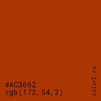 Цвет #AC3602 в цветовой модели RGB обозначается тремя октетами (172, 54, 2) в десятичном формате и #AC3602 в шестнадцатиричном (hex) формате, которые являются интенсивностью красного 172 (hex AC), интенсивность зелёного 54 (hex 36) и интенсивность синего 2 (hex 02).