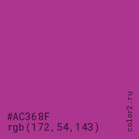 Цвет #AC368F в цветовой модели RGB обозначается тремя октетами (172, 54, 143) в десятичном формате и #AC368F в шестнадцатиричном (hex) формате, которые являются интенсивностью красного 172 (hex AC), интенсивность зелёного 54 (hex 36) и интенсивность синего 143 (hex 8F).