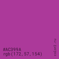 Цвет RGB(172, 57, 154) в процентом отношении количества цвета состоит из 67.5% красного (red), 22.4% зелёного (green) и 60.4% синего (blue).