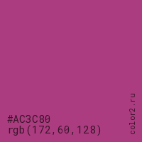Цвет #AC3C80 в цветовой модели RGB обозначается тремя октетами (172, 60, 128) в десятичном формате и #AC3C80 в шестнадцатиричном (hex) формате, которые являются интенсивностью красного 172 (hex AC), интенсивность зелёного 60 (hex 3C) и интенсивность синего 128 (hex 80).