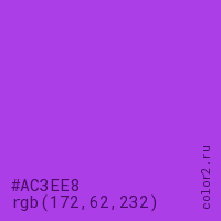 Цвет #AC3EE8 в цветовой модели RGB обозначается тремя октетами (172, 62, 232) в десятичном формате и #AC3EE8 в шестнадцатиричном (hex) формате, которые являются интенсивностью красного 172 (hex AC), интенсивность зелёного 62 (hex 3E) и интенсивность синего 232 (hex E8).