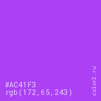 Цвет #AC41F3 в цветовой модели RGB обозначается тремя октетами (172, 65, 243) в десятичном формате и #AC41F3 в шестнадцатиричном (hex) формате, которые являются интенсивностью красного 172 (hex AC), интенсивность зелёного 65 (hex 41) и интенсивность синего 243 (hex F3).