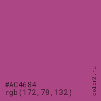 Цвет #AC4684 в цветовой модели RGB обозначается тремя октетами (172, 70, 132) в десятичном формате и #AC4684 в шестнадцатиричном (hex) формате, которые являются интенсивностью красного 172 (hex AC), интенсивность зелёного 70 (hex 46) и интенсивность синего 132 (hex 84).