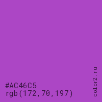 Цвет #AC46C5 в цветовой модели RGB обозначается тремя октетами (172, 70, 197) в десятичном формате и #AC46C5 в шестнадцатиричном (hex) формате, которые являются интенсивностью красного 172 (hex AC), интенсивность зелёного 70 (hex 46) и интенсивность синего 197 (hex C5).