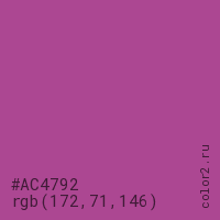 Цвет #AC4792 в цветовой модели RGB обозначается тремя октетами (172, 71, 146) в десятичном формате и #AC4792 в шестнадцатиричном (hex) формате, которые являются интенсивностью красного 172 (hex AC), интенсивность зелёного 71 (hex 47) и интенсивность синего 146 (hex 92).