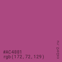 Цвет #AC4881 в цветовой модели RGB обозначается тремя октетами (172, 72, 129) в десятичном формате и #AC4881 в шестнадцатиричном (hex) формате, которые являются интенсивностью красного 172 (hex AC), интенсивность зелёного 72 (hex 48) и интенсивность синего 129 (hex 81).