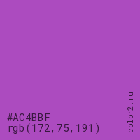 Цвет RGB(172, 75, 191) в процентом отношении количества цвета состоит из 67.5% красного (red), 29.4% зелёного (green) и 74.9% синего (blue).