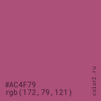 Цвет #AC4F79 в цветовой модели RGB обозначается тремя октетами (172, 79, 121) в десятичном формате и #AC4F79 в шестнадцатиричном (hex) формате, которые являются интенсивностью красного 172 (hex AC), интенсивность зелёного 79 (hex 4F) и интенсивность синего 121 (hex 79).