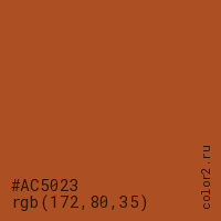 Цвет #AC5023 в цветовой модели RGB обозначается тремя октетами (172, 80, 35) в десятичном формате и #AC5023 в шестнадцатиричном (hex) формате, которые являются интенсивностью красного 172 (hex AC), интенсивность зелёного 80 (hex 50) и интенсивность синего 35 (hex 23).