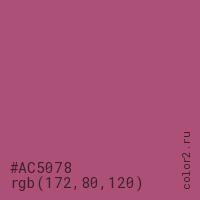 Цвет #AC5078 в цветовой модели RGB обозначается тремя октетами (172, 80, 120) в десятичном формате и #AC5078 в шестнадцатиричном (hex) формате, которые являются интенсивностью красного 172 (hex AC), интенсивность зелёного 80 (hex 50) и интенсивность синего 120 (hex 78).