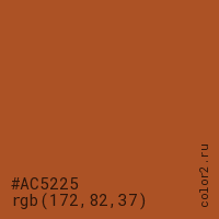 Цвет #AC5225 в цветовой модели RGB обозначается тремя октетами (172, 82, 37) в десятичном формате и #AC5225 в шестнадцатиричном (hex) формате, которые являются интенсивностью красного 172 (hex AC), интенсивность зелёного 82 (hex 52) и интенсивность синего 37 (hex 25).