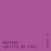 Цвет #AC5399 в цветовой модели RGB обозначается тремя октетами (172, 83, 153) в десятичном формате и #AC5399 в шестнадцатиричном (hex) формате, которые являются интенсивностью красного 172 (hex AC), интенсивность зелёного 83 (hex 53) и интенсивность синего 153 (hex 99).