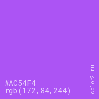Цвет #AC54F4 в цветовой модели RGB обозначается тремя октетами (172, 84, 244) в десятичном формате и #AC54F4 в шестнадцатиричном (hex) формате, которые являются интенсивностью красного 172 (hex AC), интенсивность зелёного 84 (hex 54) и интенсивность синего 244 (hex F4).