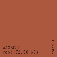 Цвет #AC583F в цветовой модели RGB обозначается тремя октетами (172, 88, 63) в десятичном формате и #AC583F в шестнадцатиричном (hex) формате, которые являются интенсивностью красного 172 (hex AC), интенсивность зелёного 88 (hex 58) и интенсивность синего 63 (hex 3F).