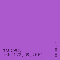 Цвет #AC59CD в цветовой модели RGB обозначается тремя октетами (172, 89, 205) в десятичном формате и #AC59CD в шестнадцатиричном (hex) формате, которые являются интенсивностью красного 172 (hex AC), интенсивность зелёного 89 (hex 59) и интенсивность синего 205 (hex CD).