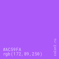 Цвет #AC59FA в цветовой модели RGB обозначается тремя октетами (172, 89, 250) в десятичном формате и #AC59FA в шестнадцатиричном (hex) формате, которые являются интенсивностью красного 172 (hex AC), интенсивность зелёного 89 (hex 59) и интенсивность синего 250 (hex FA).