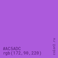 Цвет #AC5ADC в цветовой модели RGB обозначается тремя октетами (172, 90, 220) в десятичном формате и #AC5ADC в шестнадцатиричном (hex) формате, которые являются интенсивностью красного 172 (hex AC), интенсивность зелёного 90 (hex 5A) и интенсивность синего 220 (hex DC).